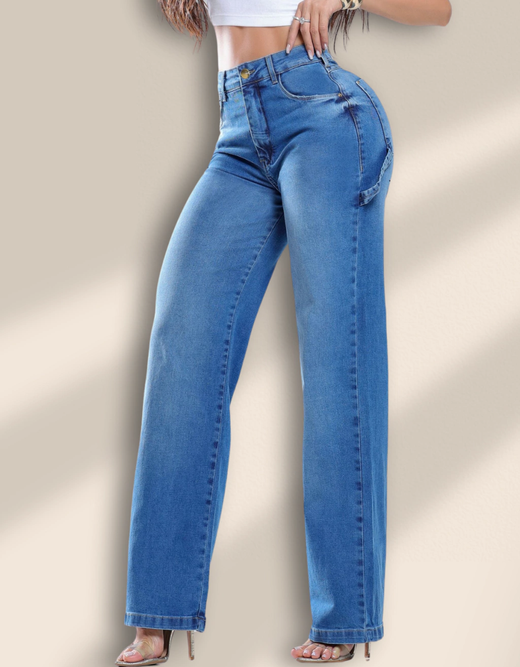Calça jeans wide leg com cintura alta, bolsos funcionais, puídos estratégicos e detalhe de passante utilitário na perna. Design atual